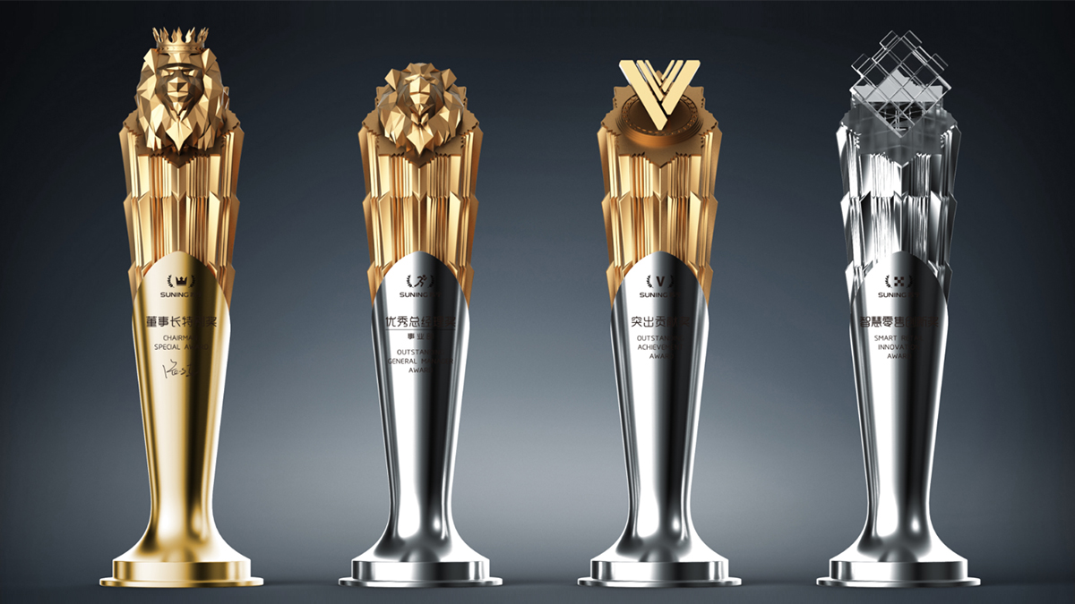 秉承企業(yè)核心精神,全力對蘇寧品牌IP“獅子”形象進(jìn)行應(yīng)用及創(chuàng)新,致力打造全新獎杯視覺語言及樹立積極奮進(jìn)的企業(yè)形象。董事長特別獎,以蘇寧企業(yè)形象“獅子”為原型進(jìn)行抽象化藝術(shù)處理,使之更具威嚴(yán)、工者氣序;優(yōu)秀總經(jīng)理獎,頒發(fā)對象為蘇寧集團(tuán)各大區(qū)有杰出貢獻(xiàn)的高管,將獅頭處理成勛章形式,以表彰高管們的杰出貢獻(xiàn);突出貢獻(xiàn)獎,此獎項頒發(fā)給具有杰出貢獻(xiàn)的團(tuán)隊。因此取“ictory:勝利”的含義,以多重重疊的“V”表示團(tuán)隊協(xié)作的無窮力量;智慧零售創(chuàng)新獎,這一特別獎項用予表彰蘇寧智慧新零售團(tuán)隊。這一年在智慧新零售行業(yè)的特別突出貢獻(xiàn),以四階魔方象征更多一層的智慧,同時獨特的水晶材質(zhì)以彰顯這一特別獎的獨特含義。