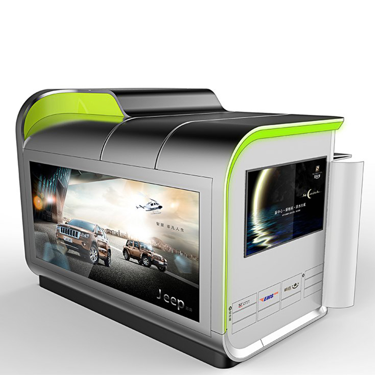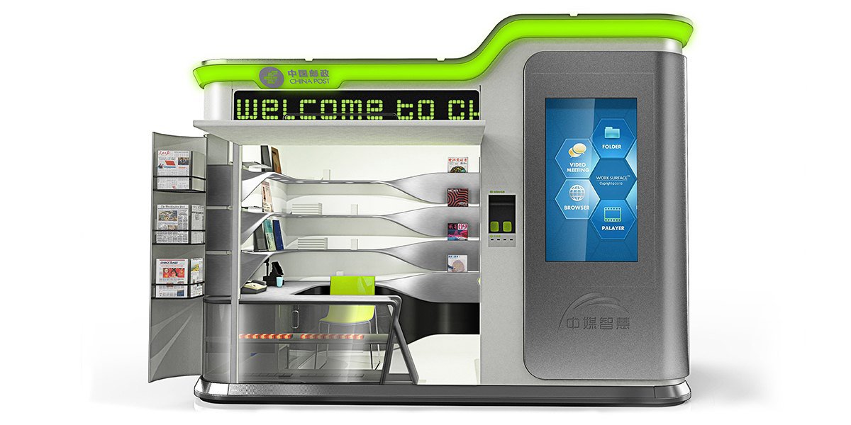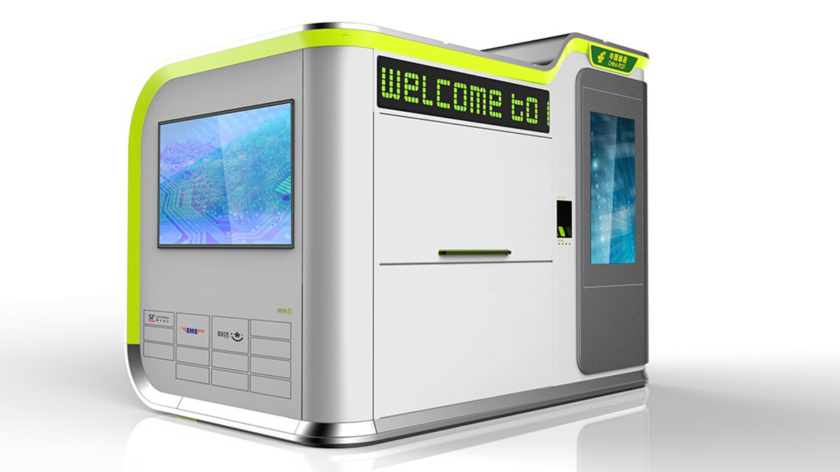 造型以現(xiàn)代簡(jiǎn)約風(fēng)格為主,順應(yīng)現(xiàn)代市場(chǎng)和審美需求。簡(jiǎn)潔的外觀、內(nèi)部流暢的曲線和燈光效果相呼應(yīng),凸顯產(chǎn)品的科技感同時(shí)又不顯得沉悶。多功能和模塊化設(shè)計(jì)更是人性化設(shè)計(jì)的主要體現(xiàn),由形式至意,從意到神韻,無不強(qiáng)調(diào)中國(guó)郵政的服務(wù)宗旨,以人為本。
