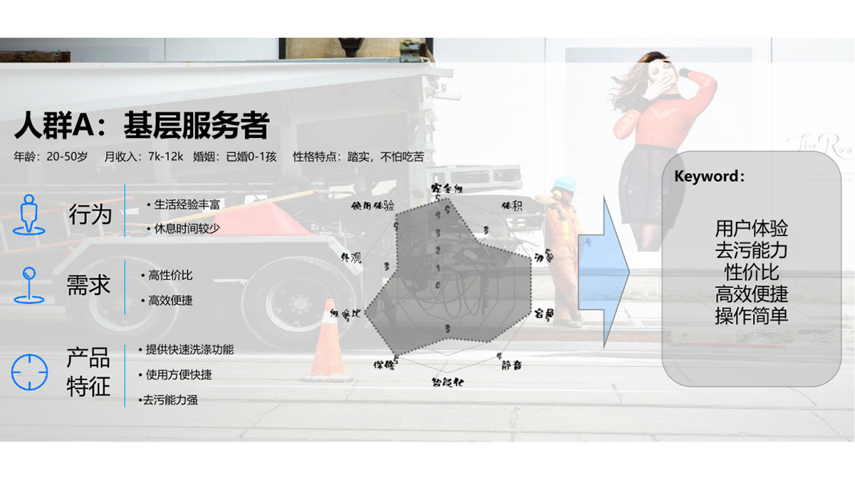 ? ? ? ? 滾筒洗衣機(jī)的普及很大程度擴(kuò)大了用戶群體,這要求團(tuán)隊(duì)需要從多個維度對人群進(jìn)行劃分和了解。從角色數(shù)據(jù)的角度,不同的職業(yè)決定了收入層次及消費(fèi)能力,從而影響滾筒洗衣機(jī)的定價。木馬團(tuán)隊(duì)深入研究劃分消費(fèi)者族群,將其分為基層服務(wù)者、非技術(shù)白領(lǐng)及商業(yè)服務(wù)業(yè)三類,分別剖析了者三類人群對于洗衣機(jī)的不同需求,并制作用戶畫像,如下圖。