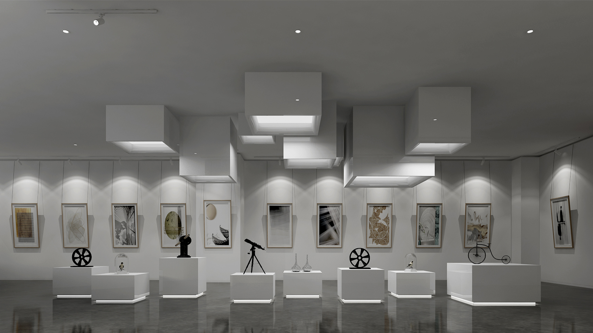 展館主要呈現(xiàn)黑白灰三色,黑白灰的色彩具有很高的審美價(jià)值,他們相互襯托,對(duì)比強(qiáng)烈,混合作用后會(huì)產(chǎn)生意想不到的藝術(shù)效果,產(chǎn)生千姿百態(tài)的節(jié)奏,極其富有韻律感和美感。這樣的空間不僅充滿(mǎn)情調(diào),更能襯托期間多彩的藝術(shù)品、豐富的畫(huà)作和內(nèi)涵的雕塑。